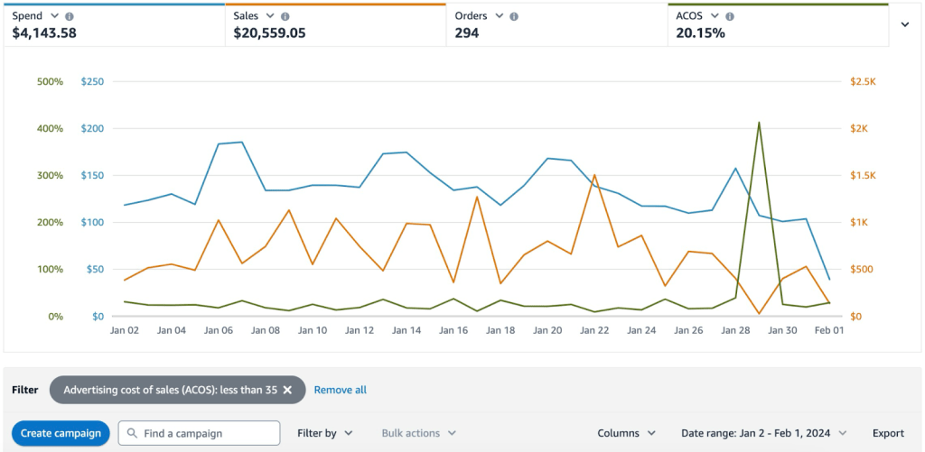 - Achieved 20.15% ACoS, keeping ad efficiency well below the 35% target filter.