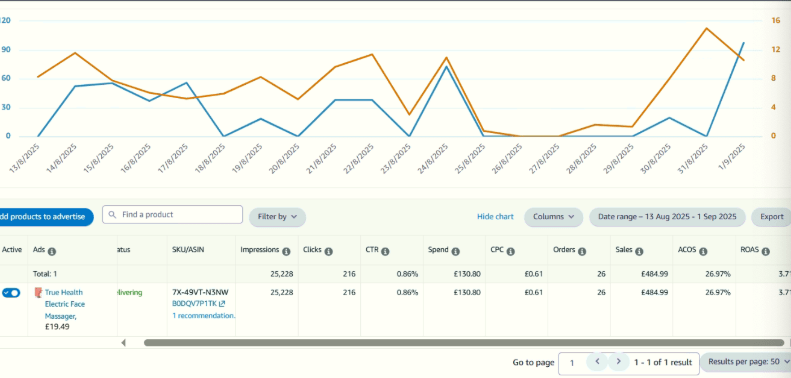 Beauty Tool – £484.99 in Sales with 26.97% ACoS (1 month W/ LIMITED BUDGET)